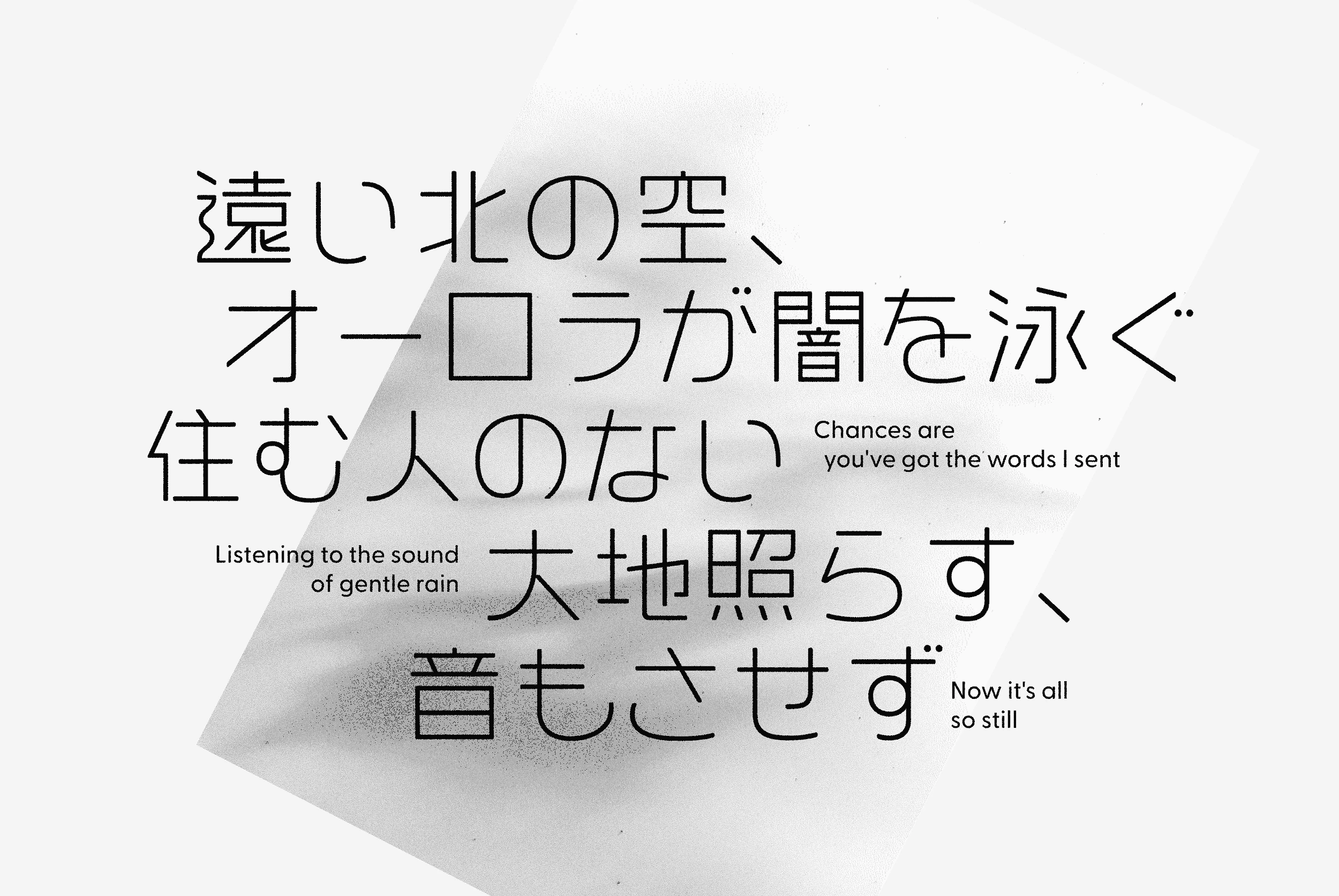 Greycliff Japanese CF is a Japanese-script adaptation of the original Greycliff CF sans serif typeface. The warm, geometric design includes full suite of 9 weights for beautiful dual-language applications. All 2800+ glyphs – covering hiragana, katakana, kanji, and romaji – were hand-drawn with a careful eye for detail. Future updates will add further kanji, including rare name and geographic glyphs.